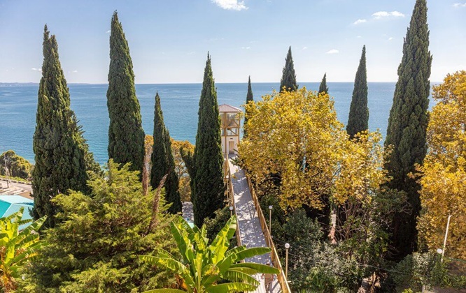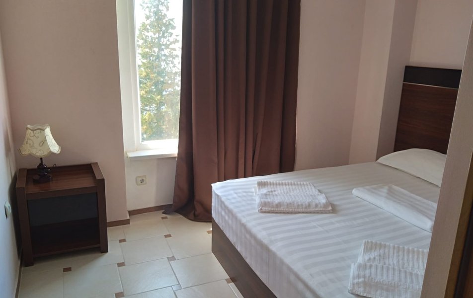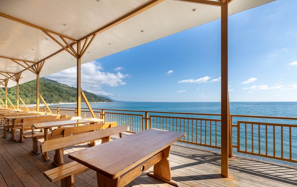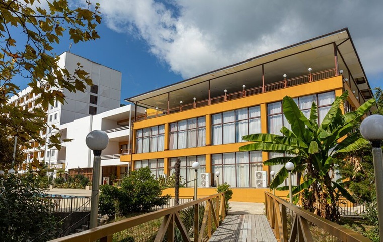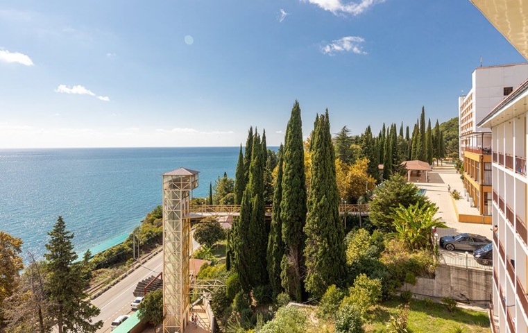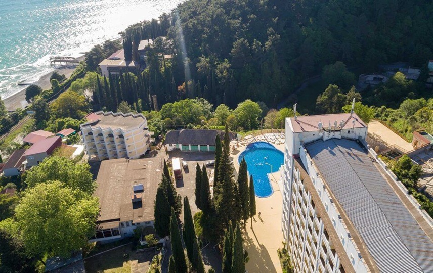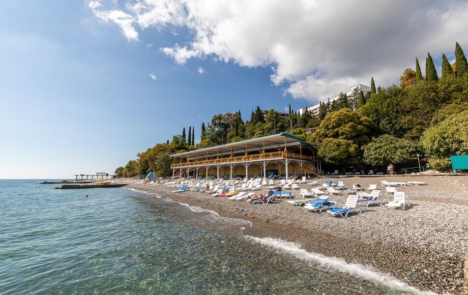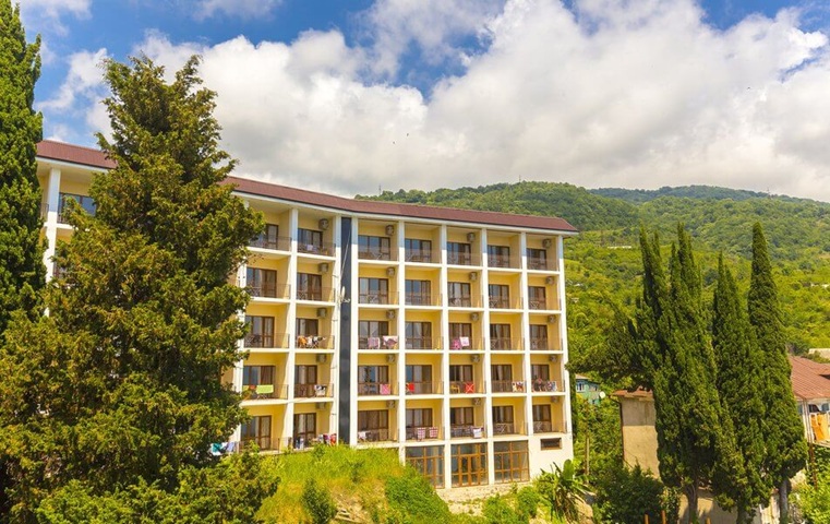 Море находится всего в 150 метрах. На собственный пляж доставит панорамный лифт. На берегу доступны гидроциклы и сапы, а шезлонги и навесы предоставляются бесплатно, а до развлечений Гагры – рукой подать: 10 минут, и вы на набережной. Отель принимает гостей с мая по сентябрь.