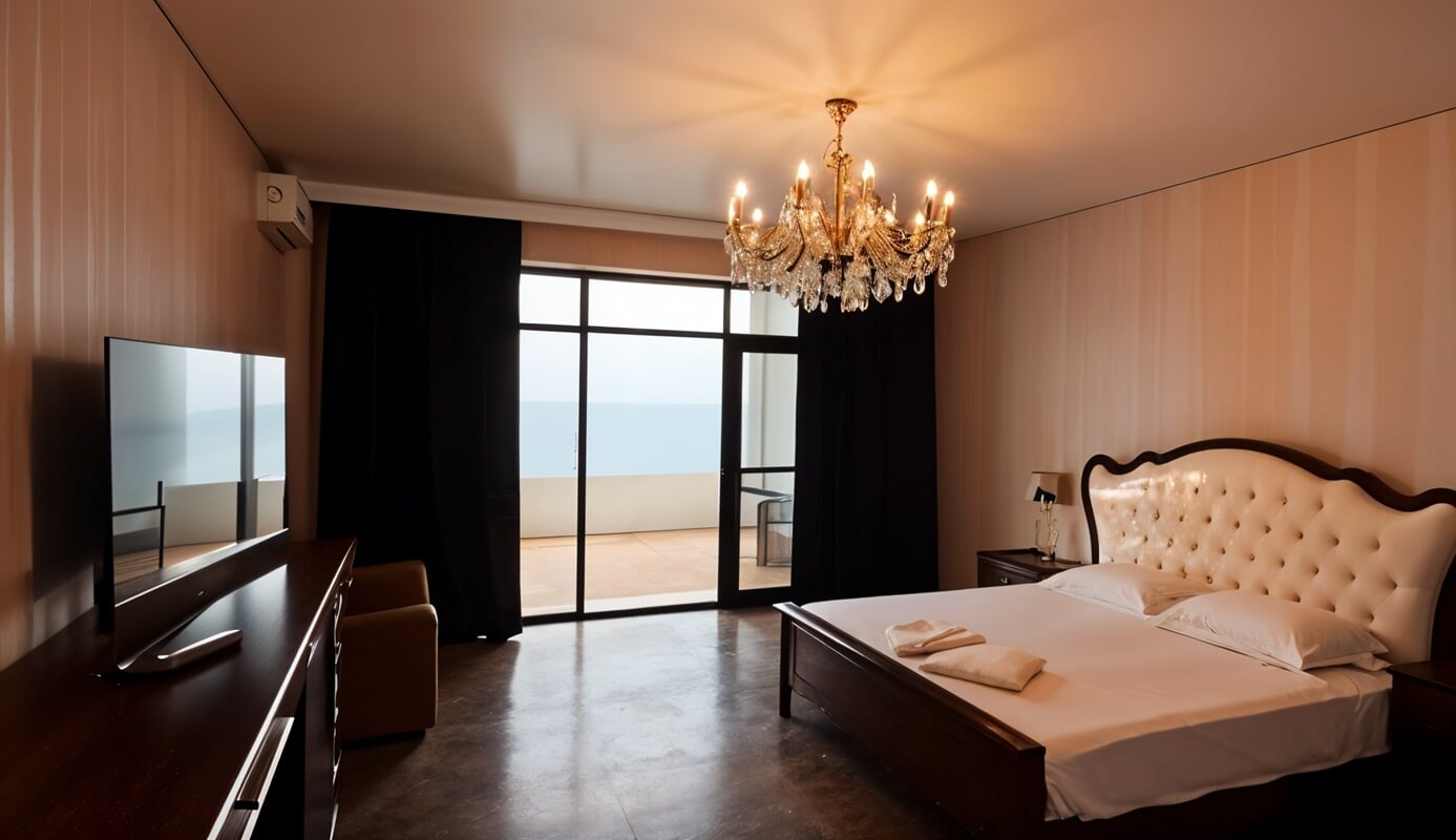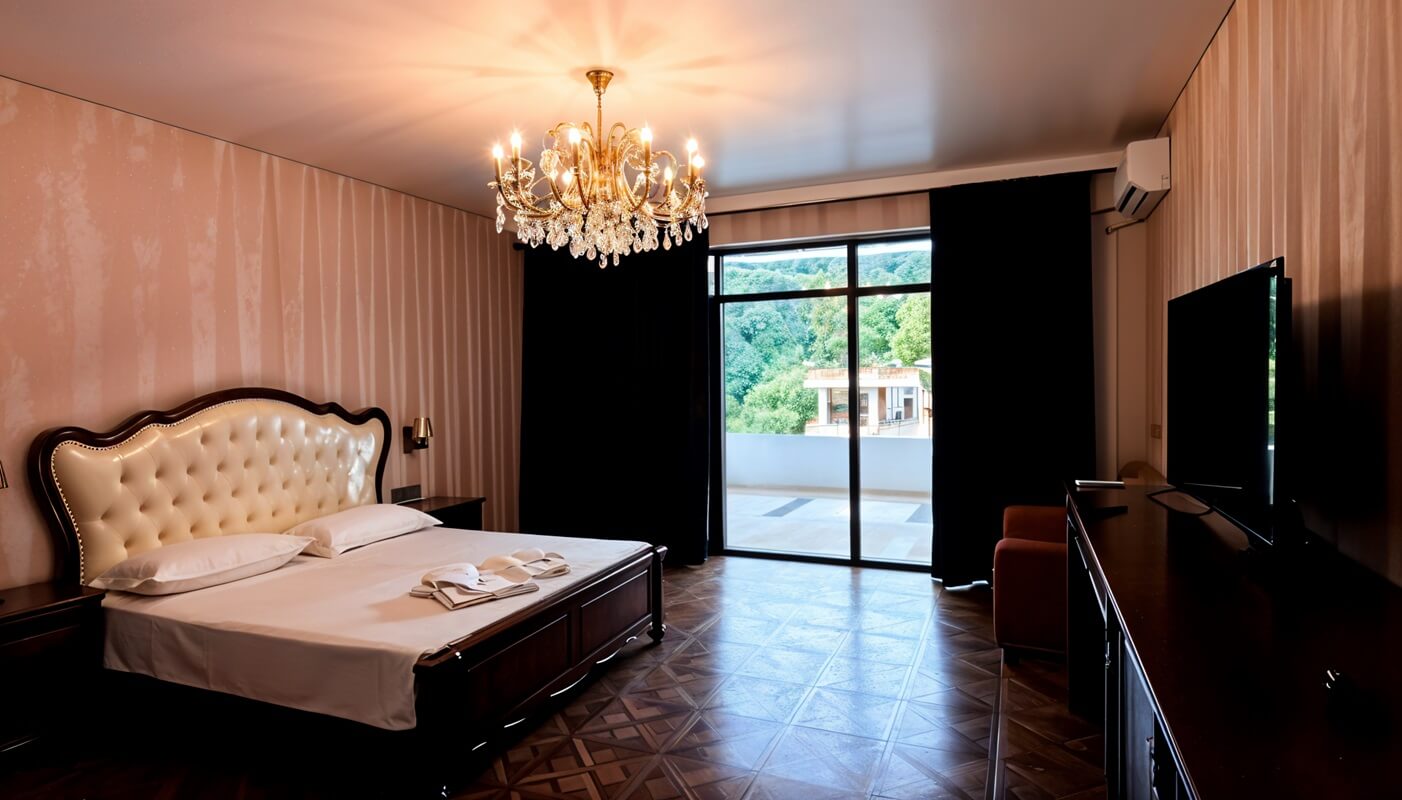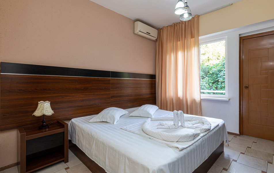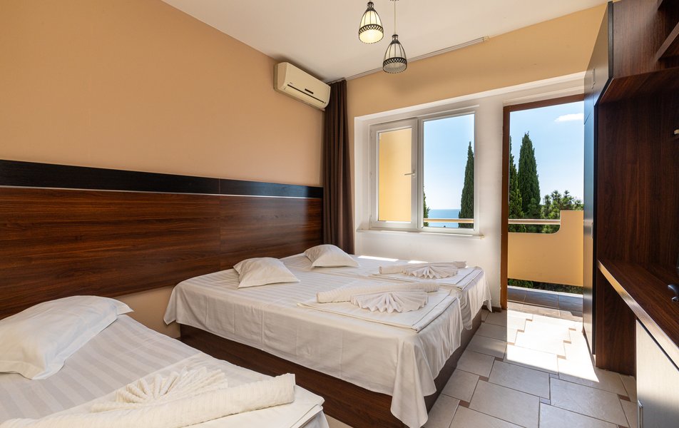 Море находится всего в 150 метрах. На собственный пляж доставит панорамный лифт. На берегу доступны гидроциклы и сапы, а шезлонги и навесы предоставляются бесплатно, а до развлечений Гагры – рукой подать: 10 минут, и вы на набережной. Отель принимает гостей с мая по сентябрь.