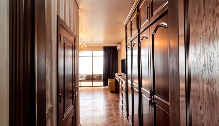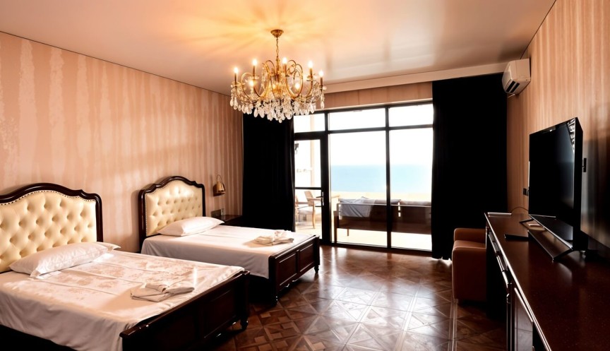 Из техники: система кондиционирования воздуха, персональный сейф, телевизор, холодильник и набор посуды для чаепития.