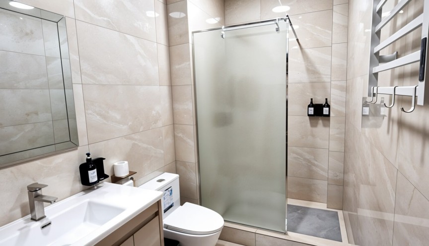 В ванной комнате: душевая кабина, тапочки, набор косметических принадлежностей, фен для сушки волос и халат.