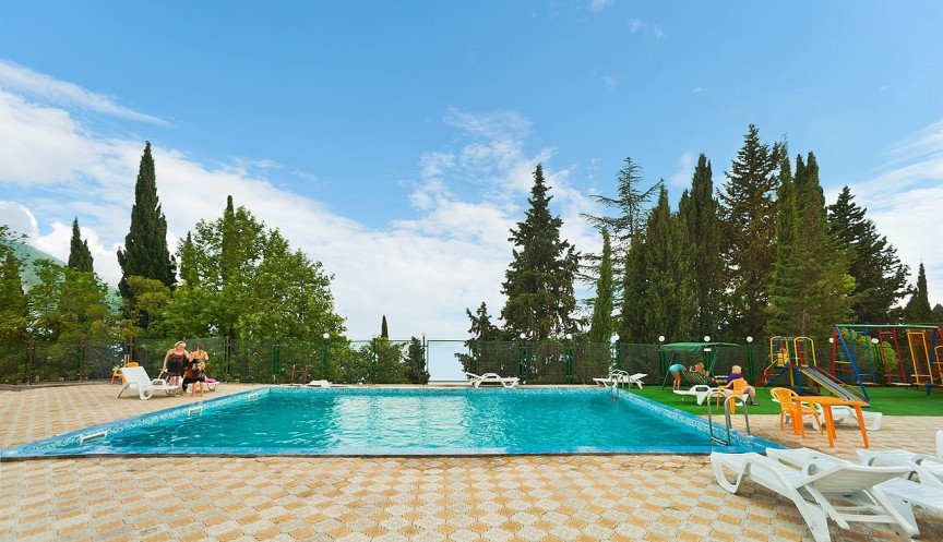 Гости могут воспользоваться открытым бассейном с пресной водой и детской площадкой. К просторному пляжу, покрытому песком и галькой, ведет удобный подземный переход. Девятиэтажный жилой корпус предлагает комфортабельные номера категорий «стандарт» и «полулюкс». В 2009 году была произведена полная реновация пансионата. Все номера оборудованы санузлом с душем, телевизором и холодильником. С балконов открываются захватывающие виды на море и горы.